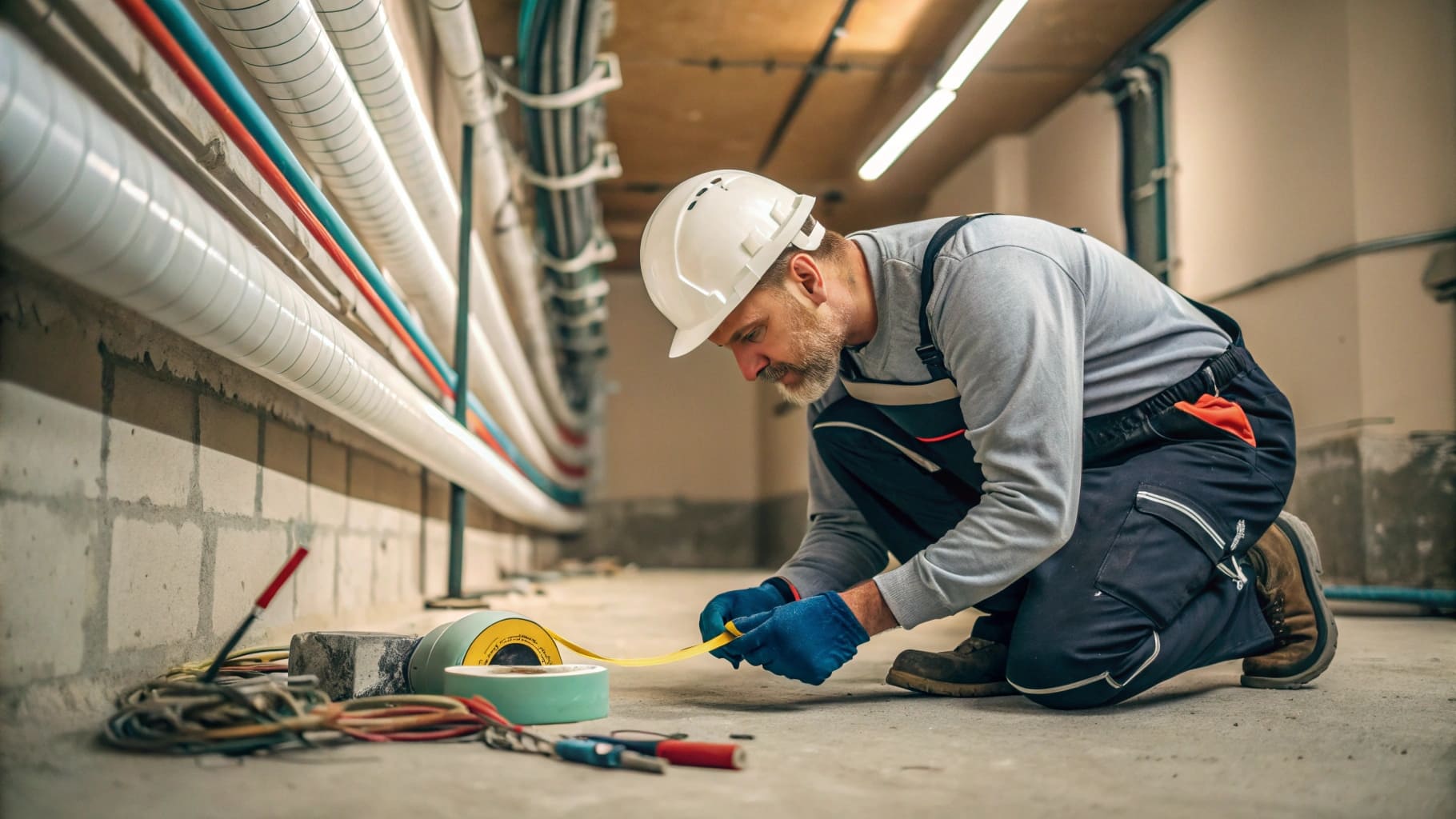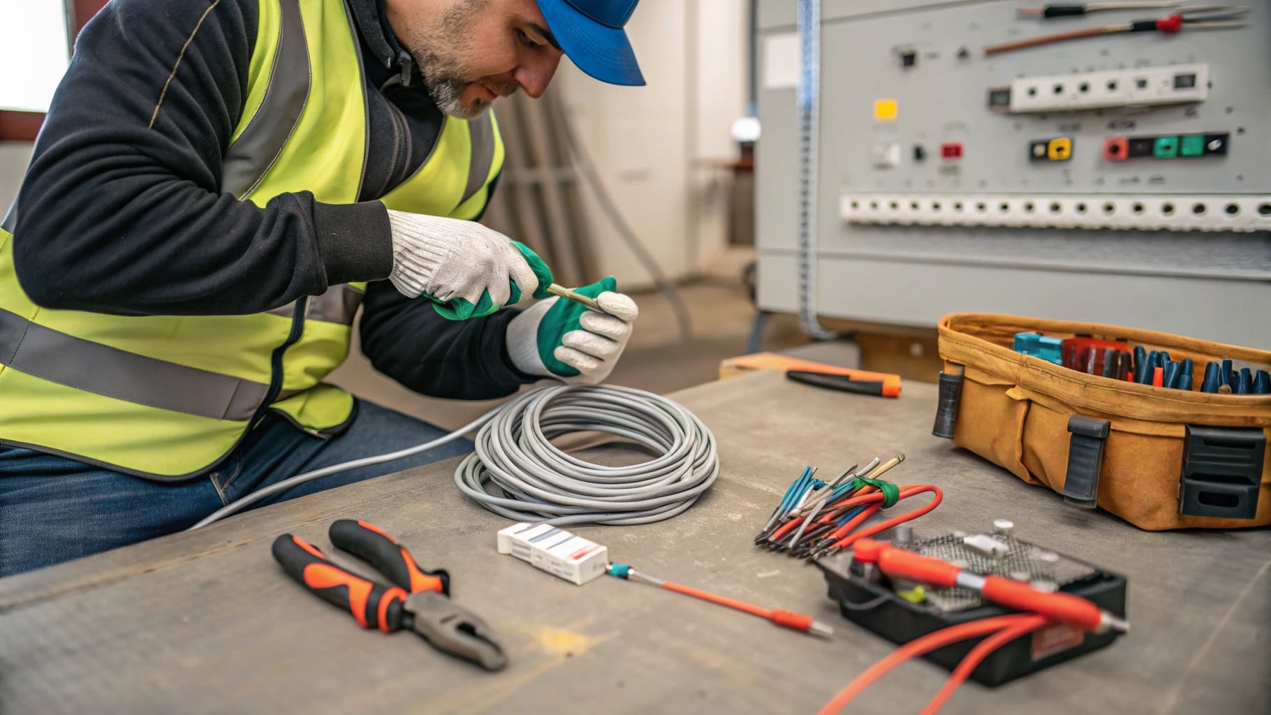 “Electrician pulling wires with a fish tape”)
